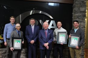 Photo 5: The finalists for the first “Tom Ballard Innovation Award” stand with PYA’s President and CEO Marty Brown, center left, and Chief Alliance Officer Tom Ballard, center right. From left, Spencer Abbott and Justin Nussbaum of Ascend Manufacturing were the third-place winners of the award, Dan Close of 490 BioTech was the first-prize winner, and Don DeRosa of Eonix LLC was the second-place winner.