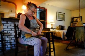 There are many methods to making brooms. Now a days, broom makers can purchase an electric kick winder for thousands of dollars. They put the grass in, and it pops out a woven broom. However, Galvas prefers to do it the old fashioned way. She separates the grass called ‘broom corn’, uses a spindle on the floor, and knots it all by hand. It takes about 45 minutes for her to do each broom.