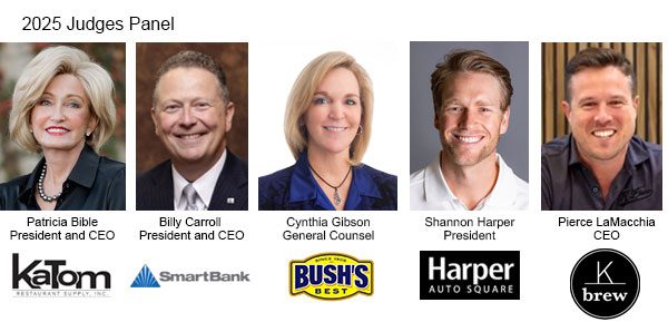 The judges include Patricia Bible, the Owner and Chief Executive Officer (CEO) of KaTom Restaurant Supply, Inc., Billy Carroll, the President and CEO of SmartBank, Shannon Harper, the President and Dealer Principal of Harper Auto Square, Pierce LaMacchia the Co-founder and Owner of K Brew, and Cynthia Gibson, the General Counsel for Bush Brothers & Company.