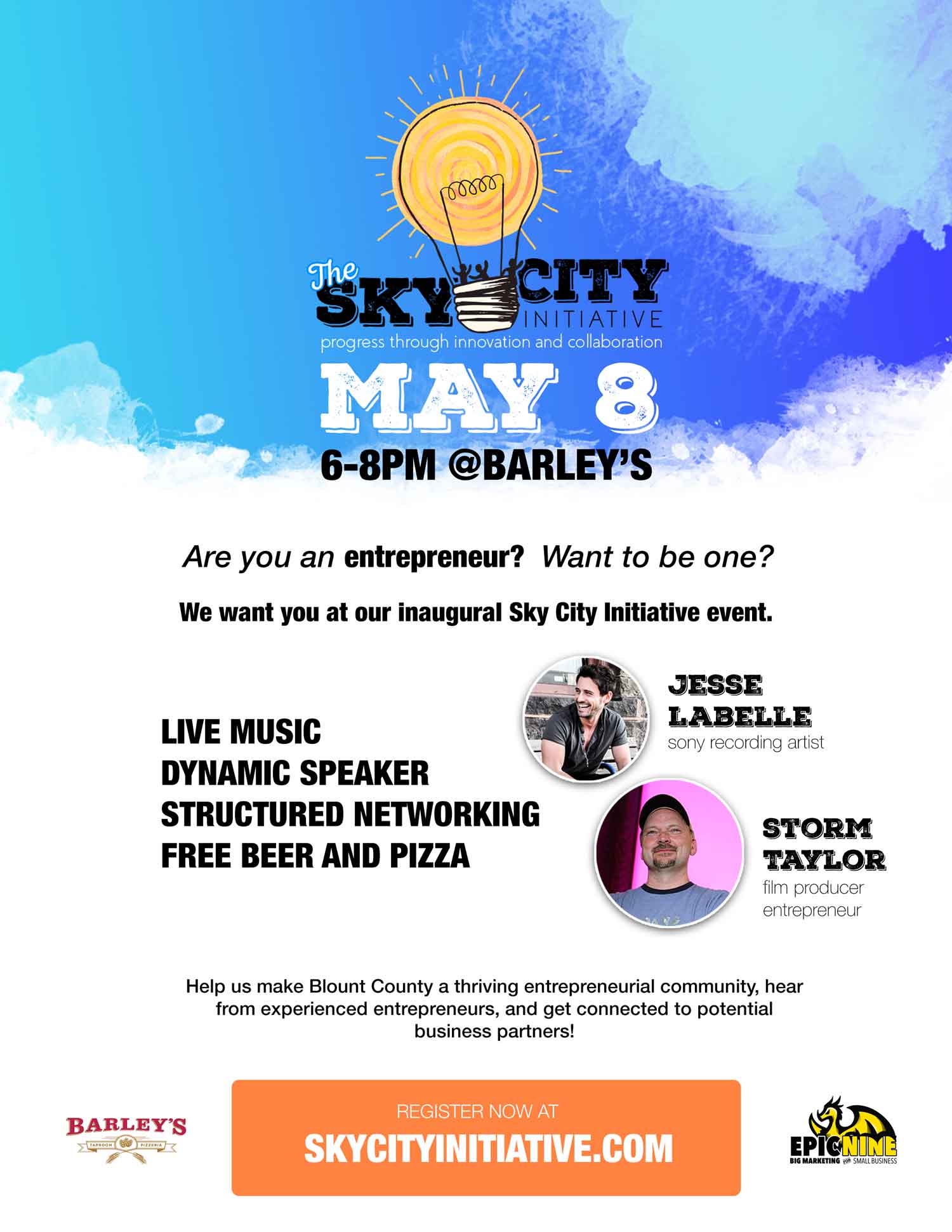 Organizers of the new “Sky City Initiative” are planning the first in a series of regular events to help accelerate a culture of entrepreneurship in the community. The inaugural meet-up is set for 6 to 8 p.m. May 8 at Barley’s Taproom, 128 West Broadway in Maryville. You can click here to register. The flyer is at the end of this post.