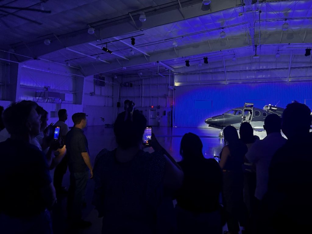 Imagine that the Cirrus team picks you up from the airport in a luxury vehicle. They know your favorite song and are playing it as they drive up to the garage. The door rises, slowly and all the lights are off. You hear your favorite song synched up inside the building. Your heart starts beater faster. Suddenly, spotlights shoot down from the ceiling and onto your newly manufactured, shiny private plane.