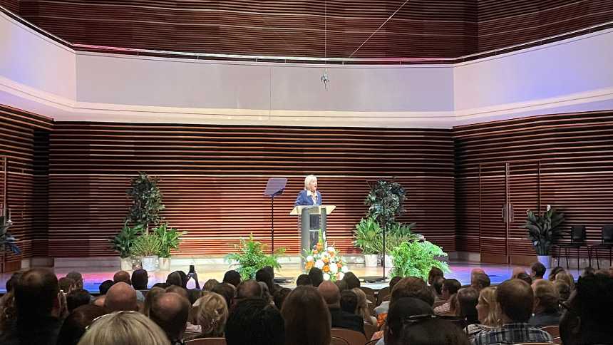 Drawing on Good to Great, Jim Collins’ signature book published in 2001, Plowman reminded those in attendance that “good is the enemy of great.” The reference to the book came during her fifth annual “Flagship Address,” delivered to a packed room in the Sandra G. Powell Recital Hall of the Natalie L. Haslam Music Center.
