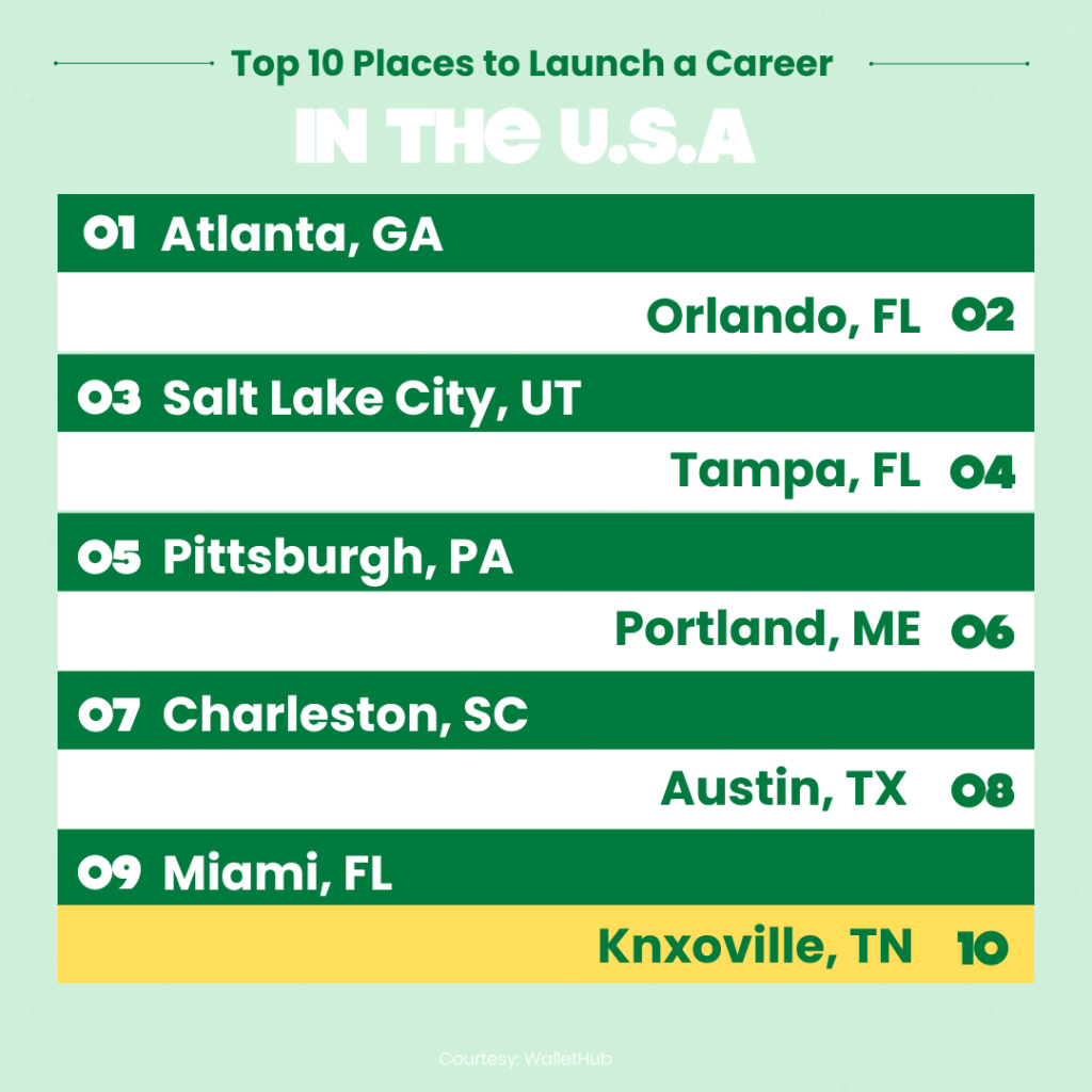 Guess who cracked the top 10? It was Knoxville at #10 nationally, the highest rated city in the Volunteer State. Chattanooga came in at #35, Nashville was #57, and Memphis was ranked at #139.