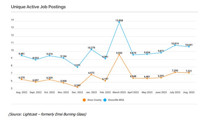 - There were 10,641 active job postings in the Knoxville MSA in August, which is good news. It’s slightly less than July’s active listings… but a big increase from the jobs that were in August 2022.