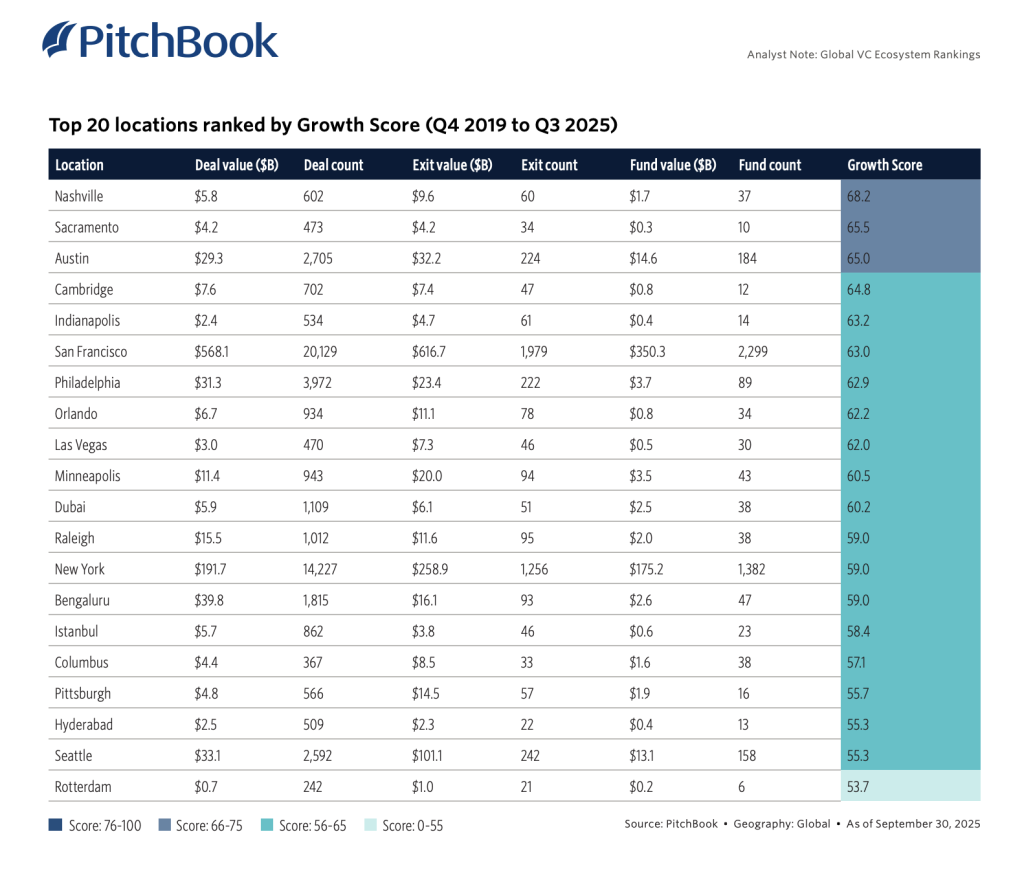 According to Pitchbook, “it is worth noting that smaller ecosystems have always made up the bulk of the top Growth Scores, as these scores showcase locations that are gathering momentum.”