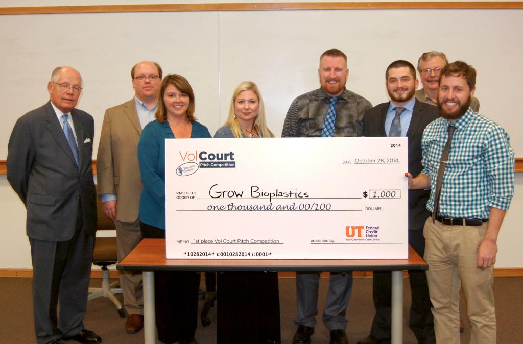 Grow Bioplastics: The individuals pictured are (left to right) the four judges – teknovation.biz Editor Tom Ballard, David Morehous of the Morehous Legal Group; Stacey Patterson, UT Research Foundation Vice President; and Myra Hamilton, UT Federal Credit Union Business Services Manager; three of the four principals of Grow Bioplastics – Tony Bova, Robbie Brese, and Jeff Beegle; and, in the background, Tom Graves.