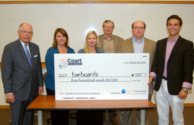 Here are the ceremonial check presentations to Grow Bioplastics, winner, and Barboards, runner-up from Tuesday night’s “Vol Court” pitch competition. Both pictures include the judges and Tom Graves, Program Coordinator for the University of Tennessee’s Anderson Center for Entrepreneurship and Innovation..