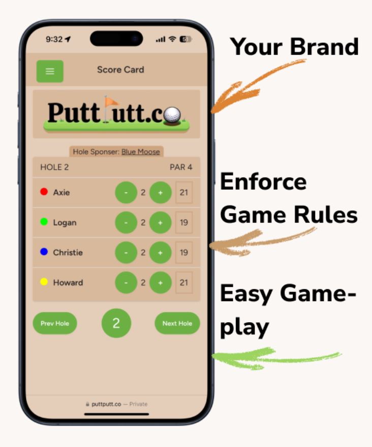 So, he created PuttPal, which is a custom website for each mini-golf course. It can be accessed through a URL or a QR code at the course, with no delay waiting for an app to download. It then populates the scorecard with accurate pars and allows different companies to sponsor each hole. Additionally, once the game is over and the final score is submitted, it redirects players to Google to leave a review for the course.