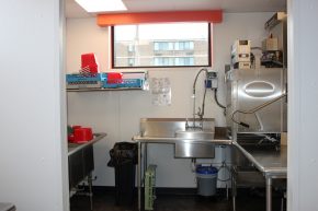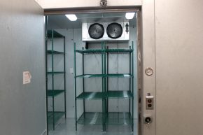 Here are some photos from our Friday tour of the space. In order, we captured the prep area, one of the stoves, Foster in the storage racks, the clean-up space that she suspects is the only one of its type locally with a window, the cold storage unit, and the unfinished space that is targeted for retail and possibly events.