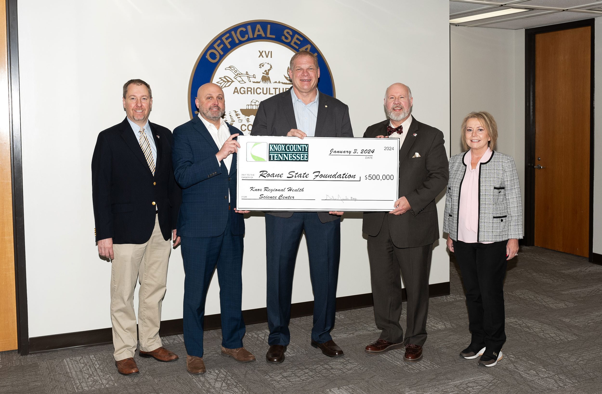 Knox County officials have committed a sum of $500,000 to the Roane State Foundation in support of the Knox Regional Health Science Education Center.  The new Roane State Community College campus is currently under construction in West Knoxville. The county already provided an initial installment of $100,000 to the Foundation and plans to continue contributing the same amount annually for the next four years.