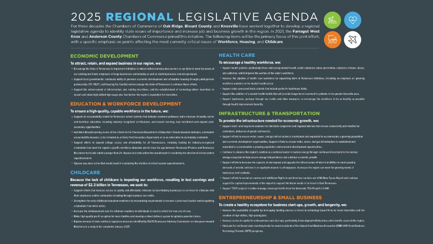 Each year, local chambers of commerce from Anderson and Blount County along with Knoxville, Farragut West Knox, and Oak Ridge collaborate to create a regional legislative agenda focused on job and business growth. After finalizing the agenda, they invite the business community to an annual breakfast, where elected officials discuss the priorities and their plans for implementation.