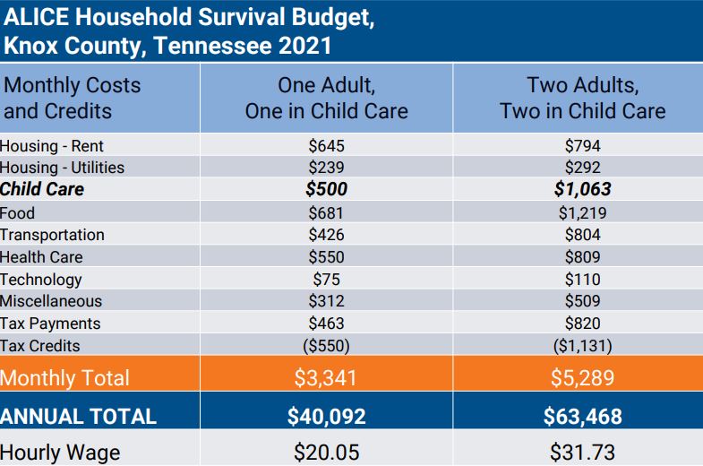 According to United Way, 2.7 million Tennesseans (about 44 percent) had income below the ALICE threshold in 2021. An ALICE family of two in Knox County could afford $500 worth of childcare each month. An ALICE family with two adults and two children in care could afford $1,063 in childcare each month. That’s tough to find in Tennessee.