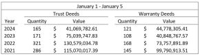 This graph, from the Register of Deeds office shows that there were fewer trust deeds from January 1-5 2024, totaling far less compared to the same week in 2021, 2022 and 2023.