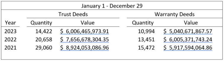 Register of Deeds, Nick McBride shows how 2023 shaped up to 2022 and 2021 when it comes to trust deeds and warranty deeds.